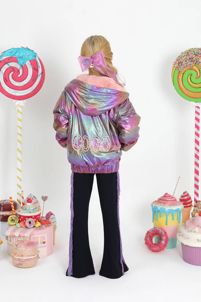 içi kürklü velboa, dışı parlak degrade özel kumaştan tasarlanmış bomber mont. model kapişonludur. kol ağzı ve etek uçları kaşkorse kumaştan yapılmıştır. üstündeki taşlı aksesuarlar bulunmaktadır.