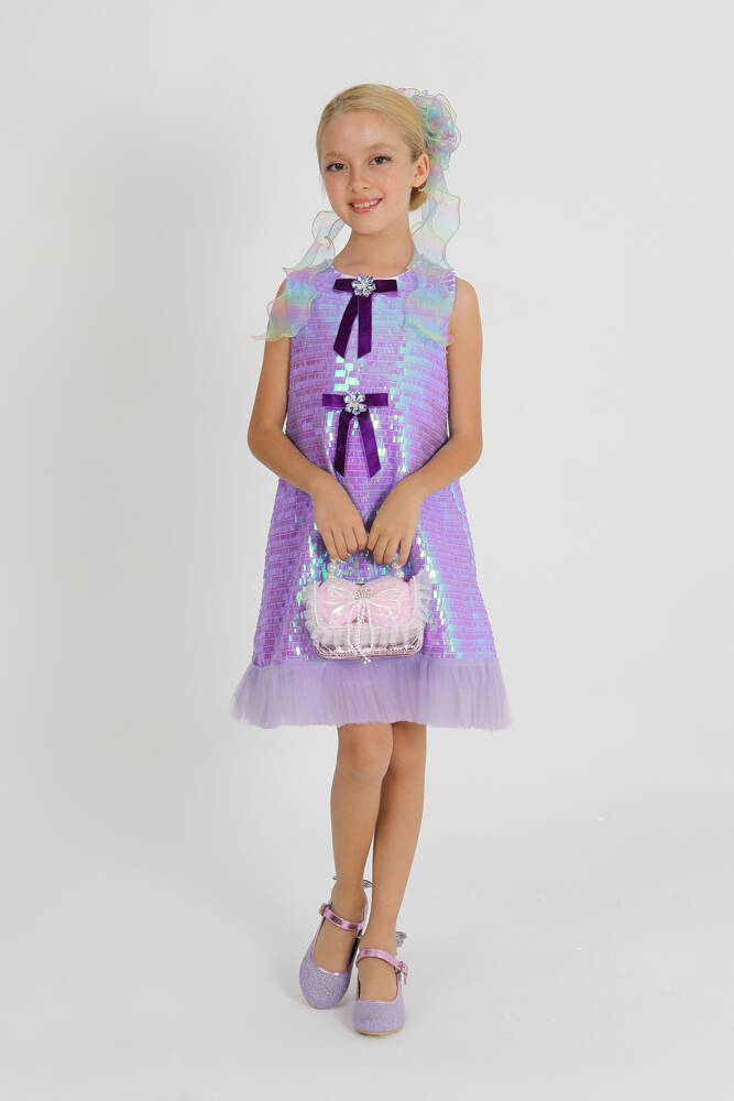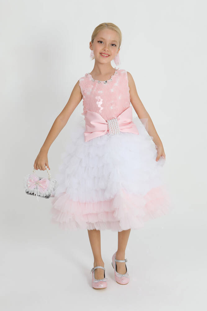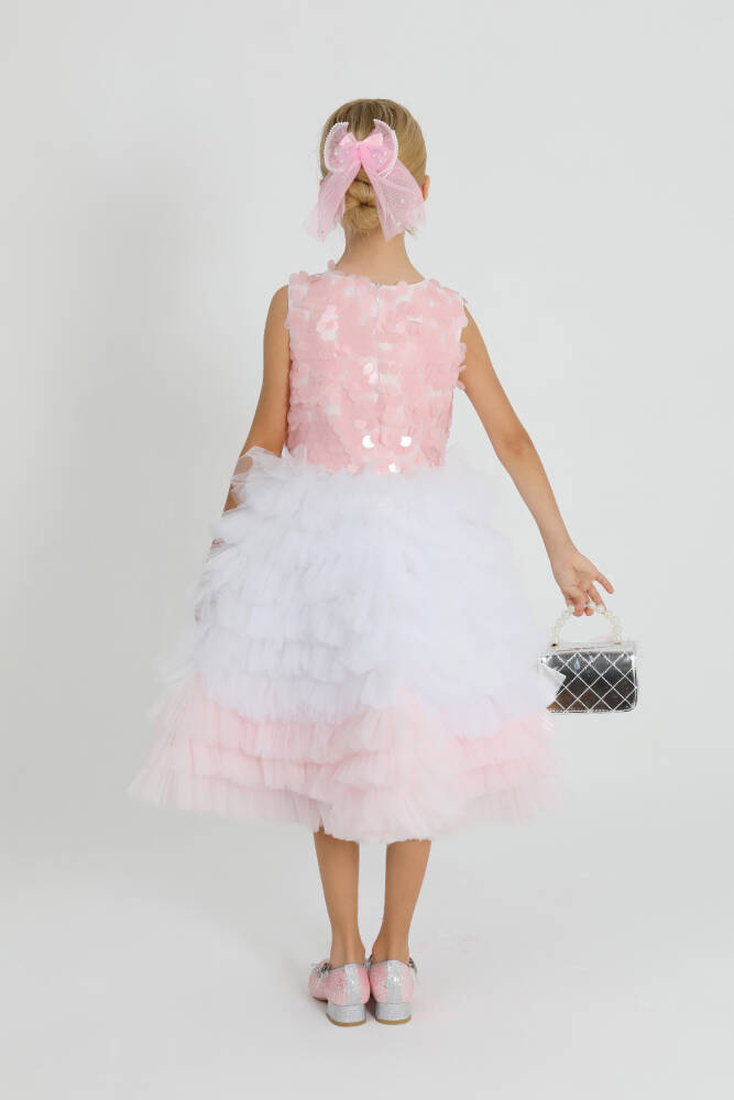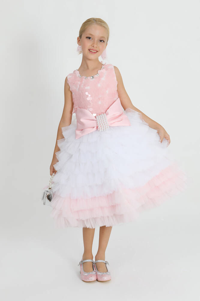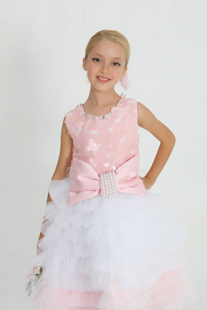 üstü payet kumaştan, alt kısmı kat kat tül dikim ile tasarlanmış özel elbise. önde işlemeli fiyonk bulunmaktadır.
