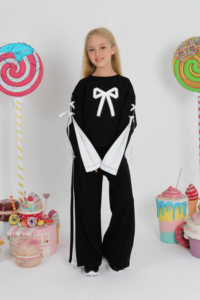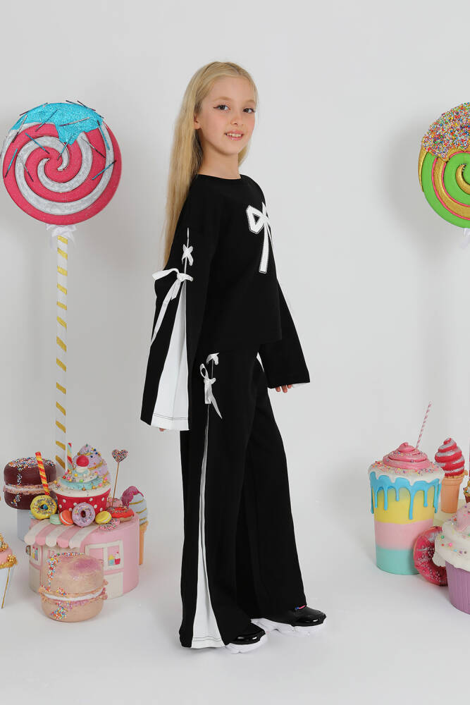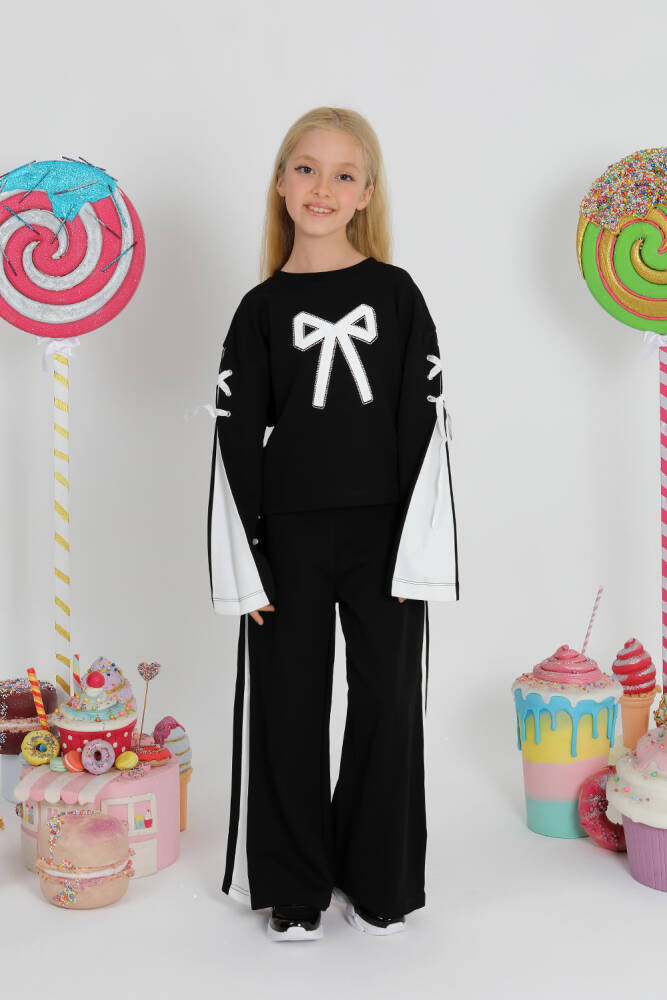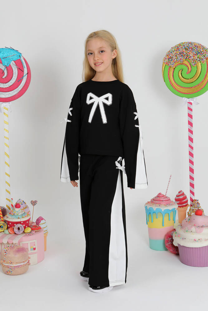 örme kumaş takım. üst renk blok ve fiyonk detaylı kuş gözleri ile fiyonk bağlanmıştır. aynı detaylar pantolondada mevcuttur. takımdır
