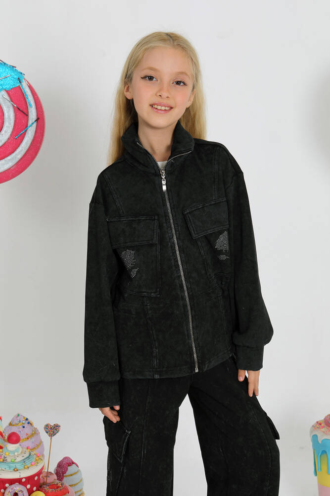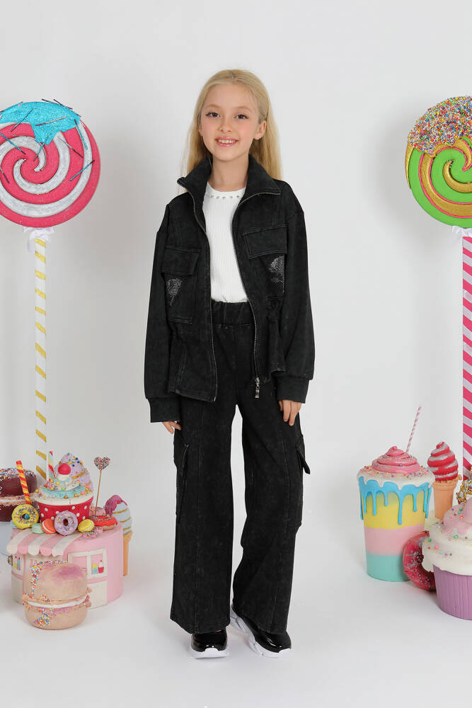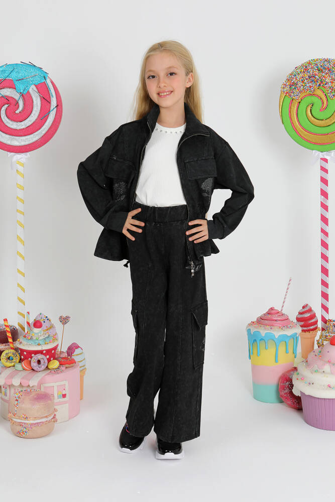 süed taş işlemeli ve dokulu metal fermuarlı eşofman üstü. eşofman altı ile kargo cep tasrımlı boncuk yapıştırma ile tasarlanmıştır.