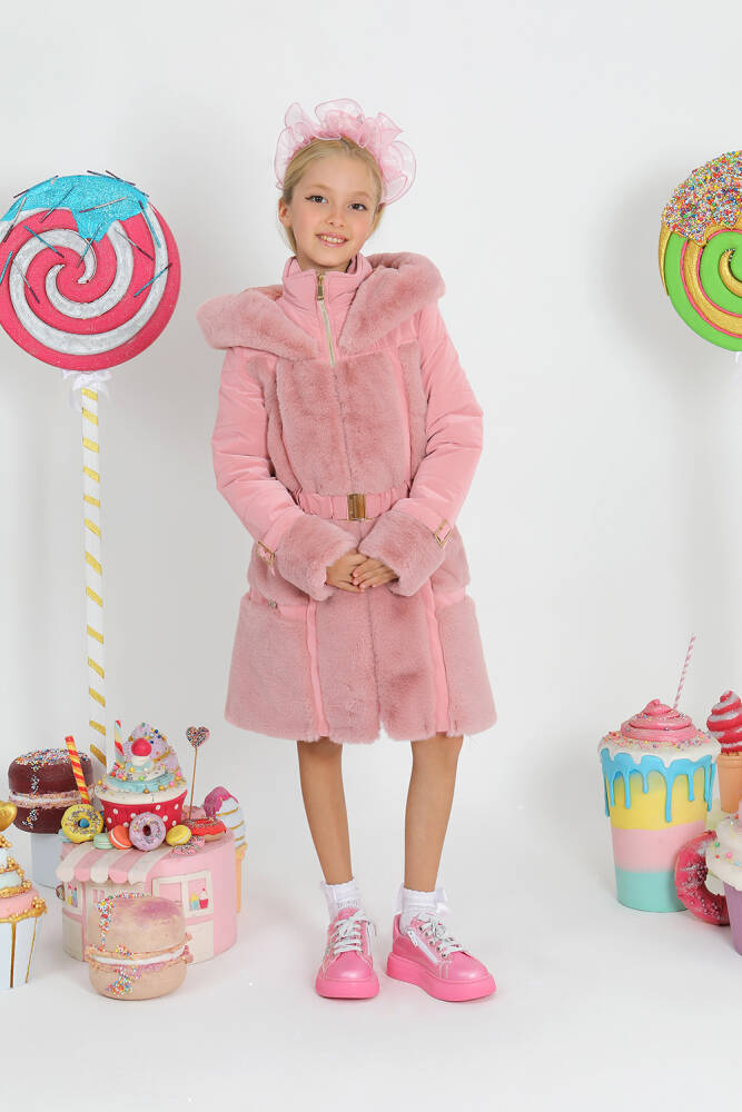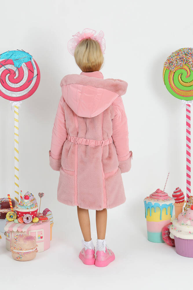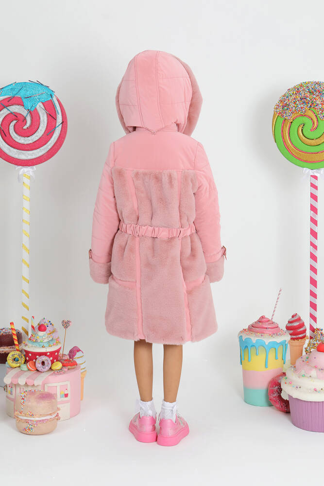 kürk ve montluk kumaş birleşimi ile tasarlanmış kemerli kapişonlu mont. içi astarlıdır.