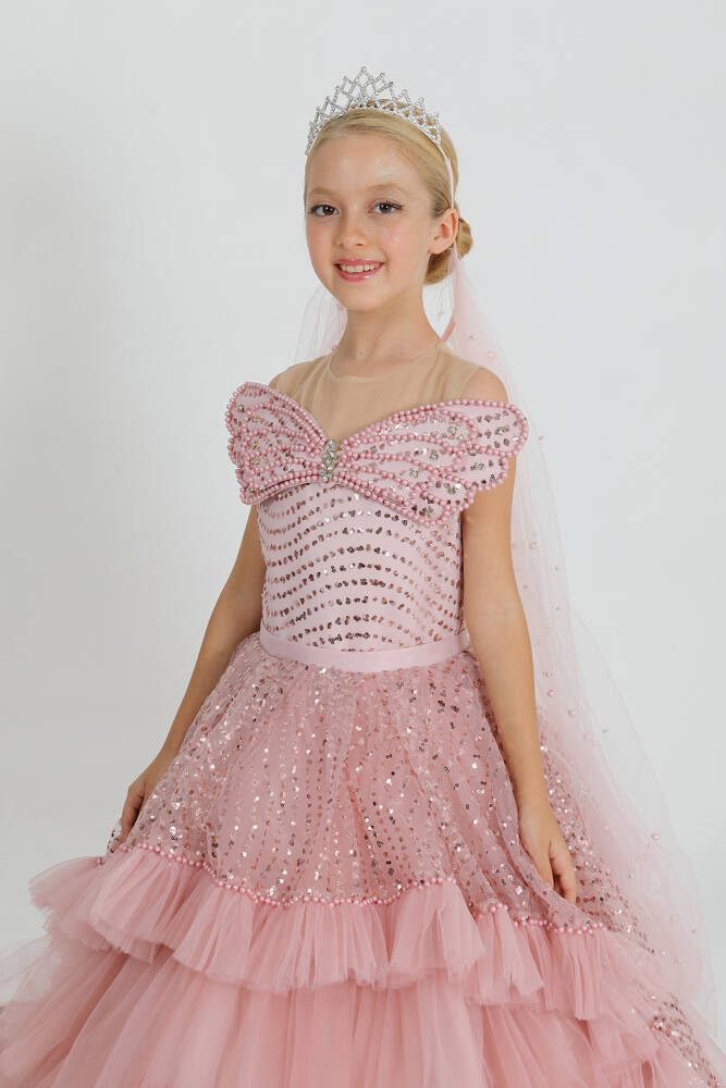 parlak simli kumaş ve tül katlı etek detaylı özel elbise