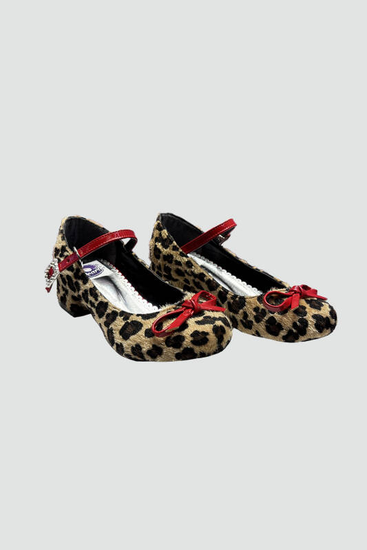 Leopar,fiyonk detay, topuklu ayakkabı. Yan taraftan toka kaplamalı.