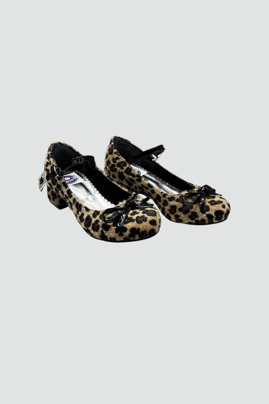 Leopar,fiyonk detay, topuklu ayakkabı. Yan taraftan toka kaplamalı.