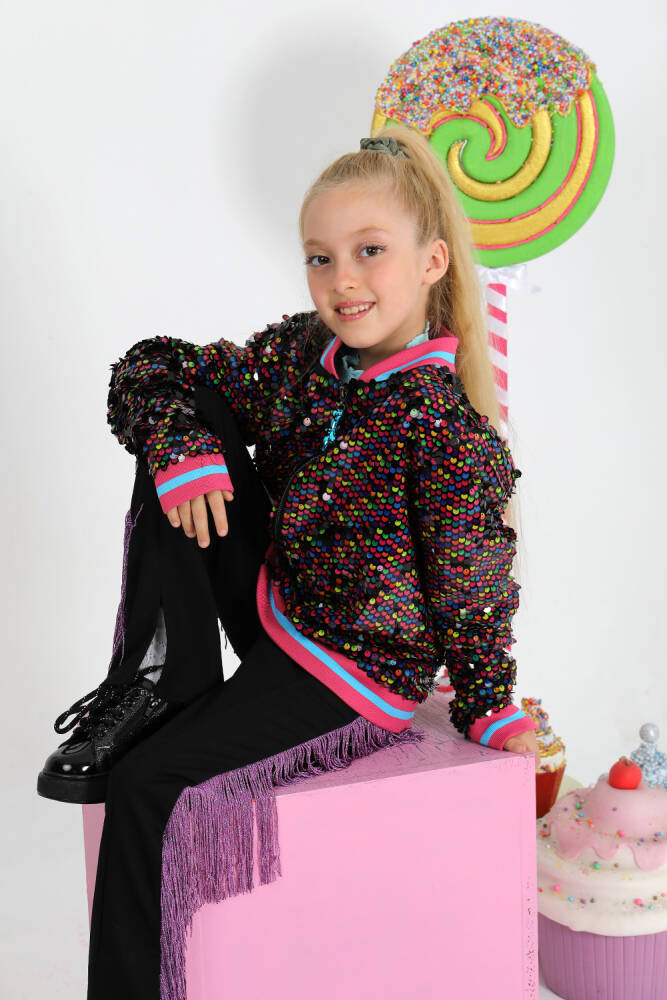 çok renkli payet özdl kumaştan tasarlanmış mont. kol ağzı ve etek uç ksıımları ribana ile tasarlanmış, özel tasarım elcik süs bulunmaktadır. iiç astarı polyesterdir.