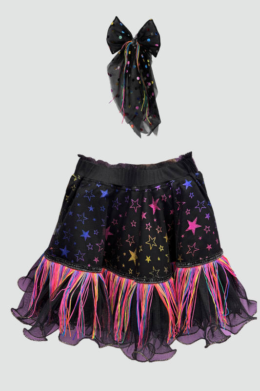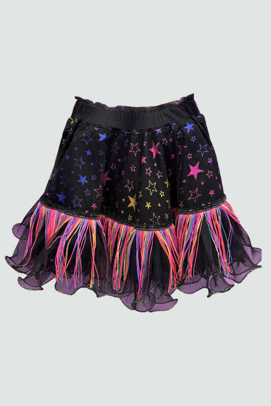 Renkli püskül detaylı,folyo yıldız baskılı tül etek. Siyah pamuk astar.Tül kaplamalı lastik kemer.