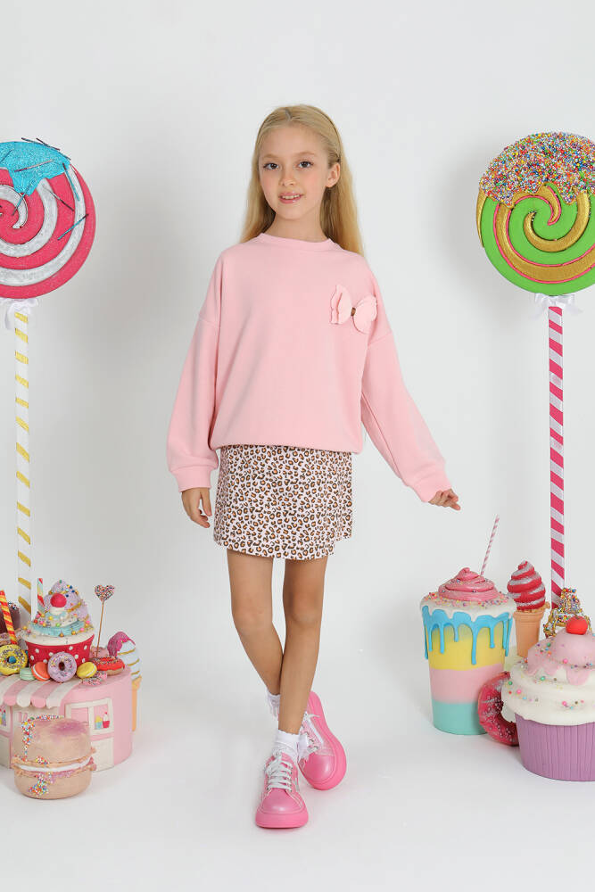 kelebek aplike dikim detaylı sweatshirt ve leopar baskılı fitilli kalın kumaştan tasarlanmış şort etek