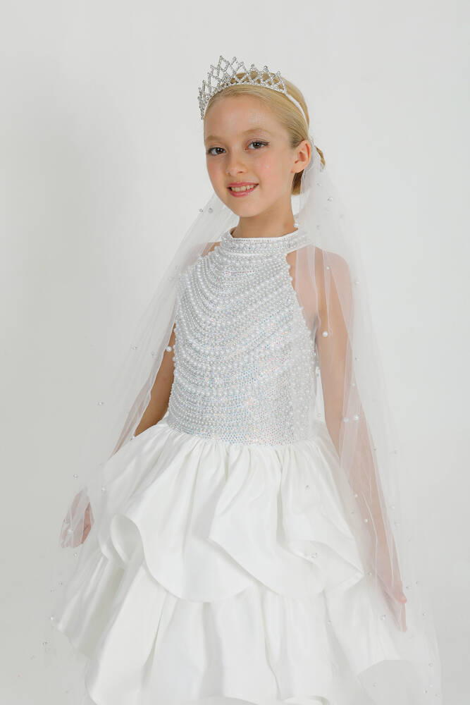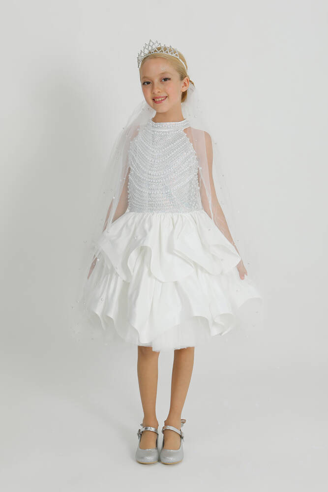 saten kumaş üstüne inci boncuk çakım detaylı kabarık etekli öxel elbise