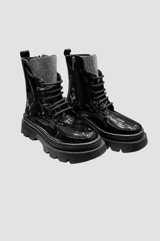 Ön kısmında taş ve bağcık detaylı bot. Yan fermuarlı kapama. Tırtıklı taban.